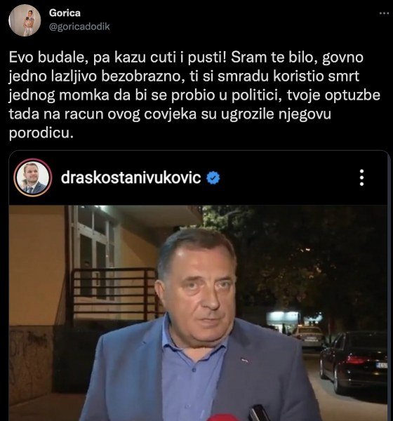 - Evo budale, pa kažu ćuti i pusti! Sram te bilo, govno jedno lažljivo bezobrazno, ti si smradu koristio smrt jednog momka da bi se probio u politici, tvoje optužbe tada na račun ovog čovjeka su ugrozile njegovu porodicu – napisala je ona, nakon što je Stanivuković objavio snimak Dodika na kome govori zašto firma TGT nije imala potrebne dozvole za uvoz kiseonika.
