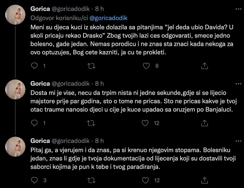 - Meni su djeca kući iz škole dolazila sa pitanjima “jel deda ubio Davida? U školi pricaju rekao Draško” Zbog tvojih laži ćes odgovarati, smeće jedno bolesno, gade jedan. Nemaš porodicu i ne znaš šta znači kada nekoga za ovo optuzuješ, Bog cete kazniti, ja cu te prokleti. Dosta mi je više, neću da trpim ništa ni jedne sekunde, gdje si se liječio majstore prije par godina, sto o tome ne pricaš. Što ne pričaš kakve je tvoj otac traume nanosio djeci u cije je kuće upadao sa oruzjem po Banjaluci – napisala je Gorica.