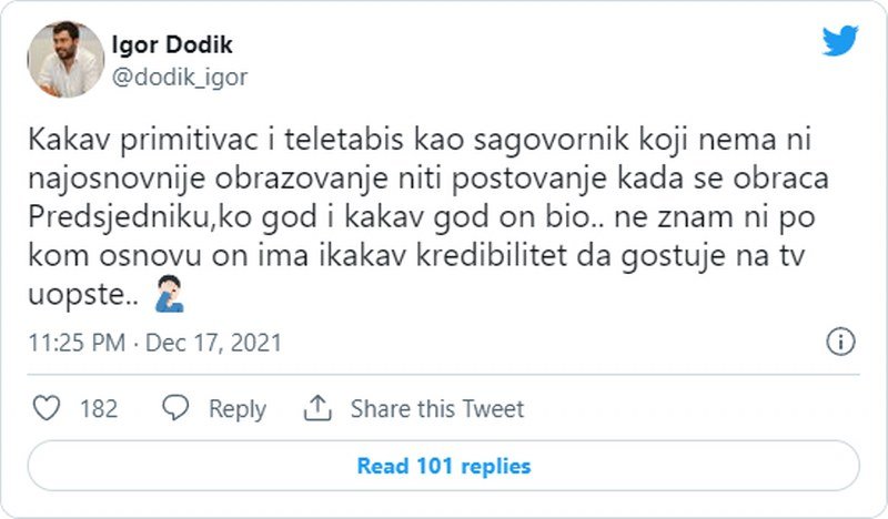 "Kakav primitivac i teletabis kao sagovornik koji nema ni najosnovnije obrazovanje niti poštovanje kada se obraca predsjedniku, ko god i kakav god on bio. Ne znam ni po kom osnovu on ima ikakav kredibilitet da gostuje na TV uopšte...", napisao je Igor.