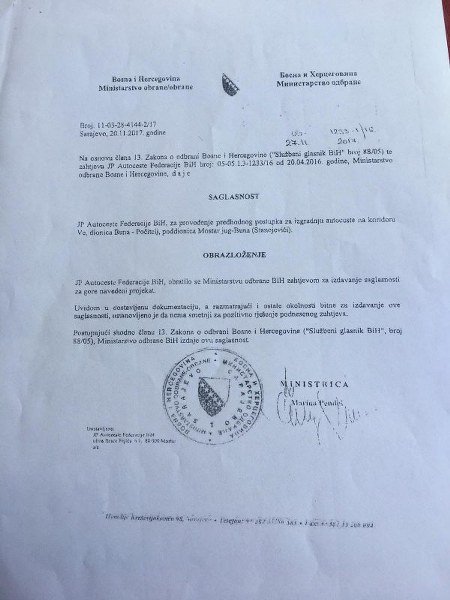 Upravo ova suglasnost argument je JP Autocesta FBIH za eksproprijaciju zemljišta za budući autoput. U ranijim istupima za medije predstavnici ovog preduzeća istakli su da imaju veoma dobru suradnju sa Ministarstvom odbrane po svim pitanjima u pogledu ove dionice autoputa.