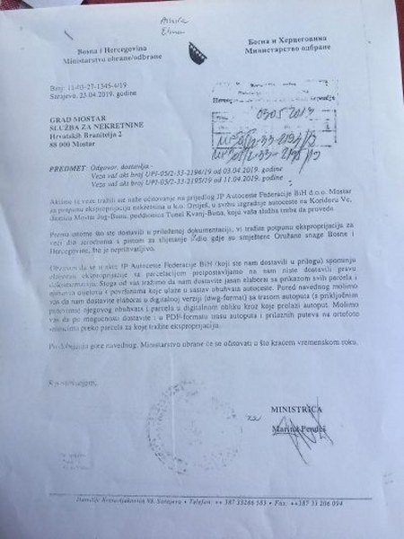 Marina Pendeš nakon što je od strane Ministarstva Odbrane BIH traženo očitovanje na prijedlog JP Autocesta FBIH za potpunu eksproprijaciju za veći dio aerodroma, od Službe za nekretnine Grada Mostara šalje zahtjev za dostavu kompletne dokumentacije.