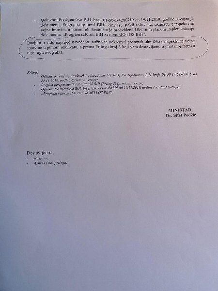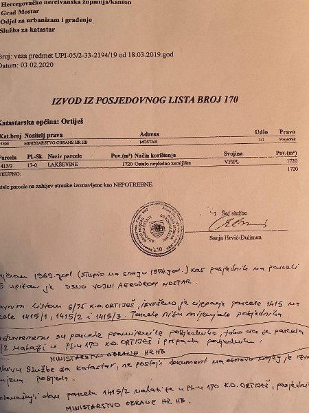 Međutim, Pravobranilaštvu BIH nisu dostavljeni zk. izvadci i posjedovni listovi koji su potrebni kako bi se uknjižile navedene nekretnine. Što potvrđuje i dokument dostavljen Ministarstvu odbrane od strane zamjenika pravobranioca Ismeta Velića.