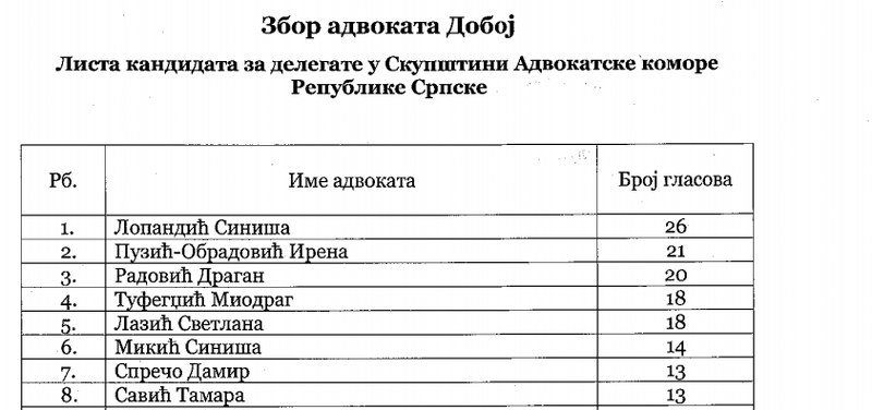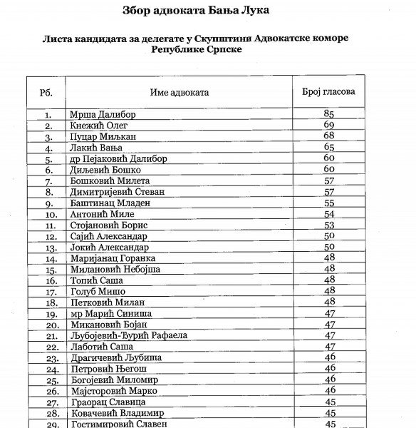 2. Delegati će birati predsjednika Advokatske komore Republike Srpske između četiri kandidata: Dalibor Mrša, Mirko Dabić, Siniša Marić i Nebojša Milanović. Interesantno je da svi pobrojani advokati dolaze iz Banjaluke.