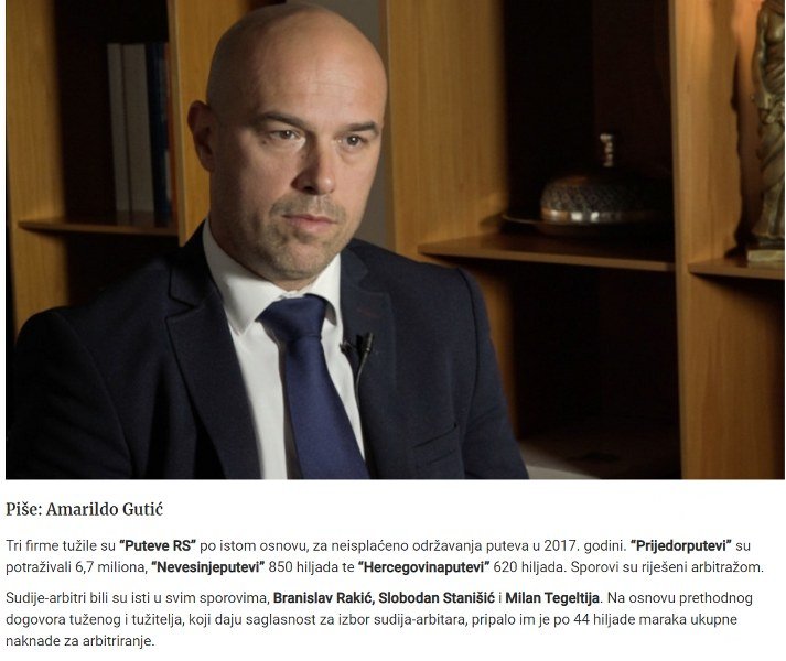 8. Rakić je poznat po namještenim arbitražama, u kojima je učestvovao sa Milanom Potkovanim Tegeltijom. Pored njih dvojice, u tim arbitražama je učestvovao i advokat Slobodan Stanišić, a njih trojica su tada inkasirali po 44.000 KM. Bitno je istaći da je pomenuti trojac taj posao dogovorio sa Nenadom Nešićem, tadašnjim direktorom firme JP „Putevi RS“. Nešić je cijeli posao dogovorio lično sa Potkovanim, a Rakić i Stanišić su ciljano izabrani.