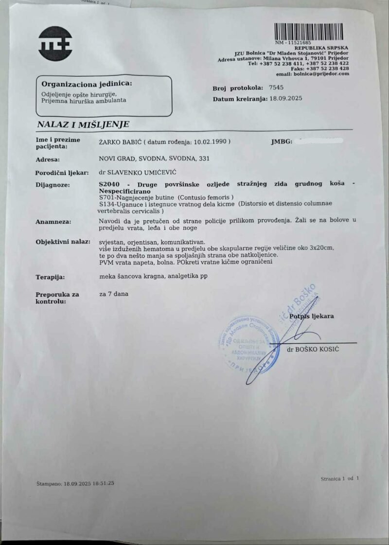 – Nakon svega su me pustili, ali i opet pozvali na telefon, jer su pogriješili u papirologiji pa sam im, iako izmučen, pomogao da isprave kvalifikaciju krivičnog djela na koje sam dao izjavu kao svjedok. Kada sam krenuo kući, u Kozarcu mi je pozlilo, osjetio sam da gubim svijest i završio sam u hitnoj pomoći. Pozvao sam suprugu da dođe po majku i kćerku i onda sam ispričao šta se dogodilo. Konstatovane su mi povrede dva pršljena i brojne modrice po tijelu – naveo je Babić.