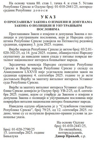 Ukaz o proglašenju sa cijelim tekstom zakona objavljen je u današnjem Službenom glasniku RS.