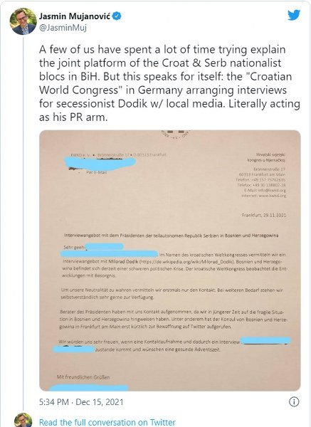 Savjetnici predsjednika stupili su sa nama u kontakt, jer smo i ranije nagovještavali na krhku situaciju u zemlji. Između ostalog je konzul Bosne i Hercegovine u Frankfurtu, nedavno pozvao na naoružavanje putem Tvitera. Radovali bismo se kada biste uspjeli stupiti u kontakt, a potom i realizovali intervju”, navodi se u pismu Hrvatskog svjetskog kongresa njemačkim medijima.