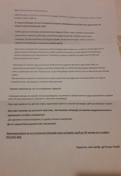 “Ovo nije vrijeme za dječije igre, pročitane priče i stalne izgovore, već za ozbiljan posao! Zato vas pozivam da dignemo svoj glas, potpišemo peticiju za opoziv gradonačelnika i prekinemo pogubnu vladavinu! Da krenemo putem oporavka, a odmah potom i napretka! Da se našom Banjalukom opet ponosimo”, navodi se u Đajićevom pismu „dragim Banjalučankama i Banjalučanima“, uz podugačak spisak onoga što zamjera Stanivukoviću.