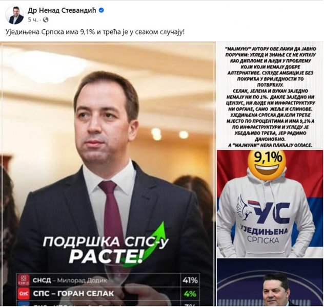 “Majmunu, autoru ove laži, da javno poručim: ugled i znanje se ne kupuju kao diplome i ljudi u problemu koji nemaju dobre alternative. Sulude ambicije bez pokrića i vrijednosti to potvrđuju. Selak, Jelena i Vukan, zajedno nemaju ni po 1 odsto. Dakle, zajedno, ni cenzus, ni infrastrukturu, ni organe, samo želje i spinove“, naveo je Stevandić u objavi na društvenim mrežama, direktno postavljajući i fotografiju Gorana Selaka sa nalazima istraživanja.