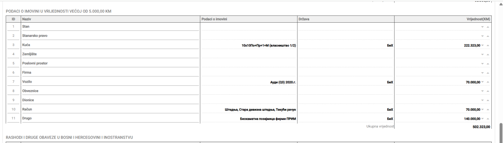 Foto: Faksimil dijela imovinske izjave Željke Cvijanović date CIKBiH: Navela i podatak o beskamatnoj pozajmici
