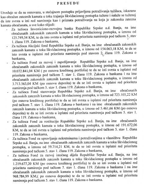 Akcijskom fondu je priznato 154.063 KM, Fondu za razvoj i zapošljavanje 13,7 miliona KM, Fondu stanovanja 728.566 maraka, Fondu za restituciju 191.672 KM, Fondu za upravljanje nekretninama i potraživanjima u vlasništvu RS priznato je 59.714 KM, dok je Fondu za razvoj i zapošljavanje priznato potraživanje 2,2 miliona maraka.