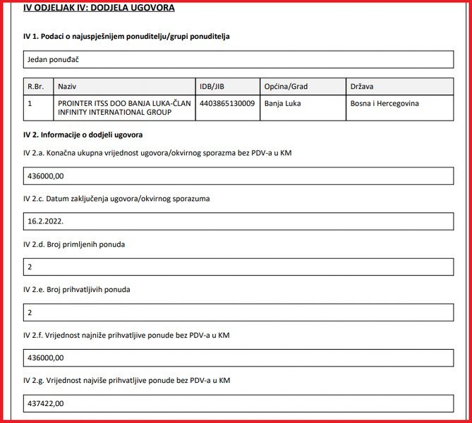 „EP HZHB“ prethodno je posao procijenila na 675.605 KM sa uračunatim PDV-om, „Prointer“, firma s kojom „sarađuje“ sin Milorada Dodika, Igor, nudio se za 510.120 KM. Druga ponuda, stoji u obavještenju o dodjeli ugovora, bila je vrijedna 511.784. Upravi javnog preduzeća, kojim upravlja HDZ-ov Marinko Gilja, bilo je lako da odabere stručnjake.