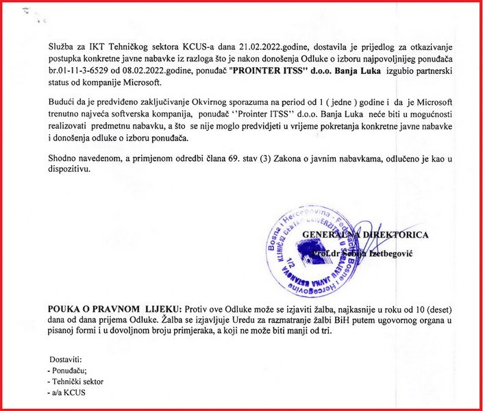 „Budući da je predviđeno zaključivanje okvirnog sporazuma na godinu dana i da je 'Microsoft' trenutno najveća softverska kompanija, ponuđač 'Prointer ITSS' neće biti u mogućnosti da realizuje predmetnu nabavku, a što se nije moglo predvidjeti u vrijeme pokretanja javne nabavke i donošenja odluke o izboru ponuđača.“