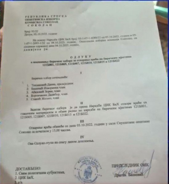 Naime, dokument o imenovanju Biračkog odbora Sokolac ovjeren je pečatom na kome je dvoglavi orao.