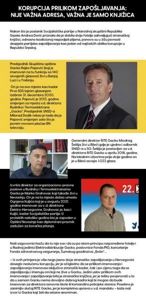 – Iz ovih primjera je više nego jasno da je stranačko zapošljavanje u Hercegovini doseglo neslućenu korupciju, jer je očigledno da se prilikom imenovanja i zapošljavanja imenovao isključivo stranački kadar, čak i po cijenu toga da se zapošljavaju i imenuju oni koji ne žive u Gacku. Jedini uslov prilikom ovih imenovanja i zapošljavanja bila je stranačka knjižica, jer je teško povjerovati u to da u samom Gacku nema dovoljno dobrog kadra koji bi mogao da bude imenovan za direktora osnovne škole ili komandira policijske stanice. Posebno je zanimljiv slučaj RITE Gacko, jer je kompletna uprava u v.d. mandatu – kaže naš izvor iz Gacka koji želi da ostane anoniman.