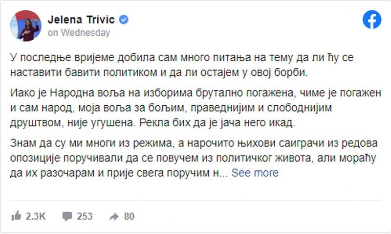 "U poslednje vrijeme dobila sam mnogo pitanja na temu da li ću da se nastavim baviti politikom i da li ostajem u ovoj borbi. Iako je Narodna volja na izborima brutalno pogažena, čime je pogažen i sam narod, moja volja za boljim, pravednijim i slobodnijim društvom, nije ugušena. Rekla bih da je jača nego ikad", napisala je Jelena Trivić, na svom Fejsbuk profilu.