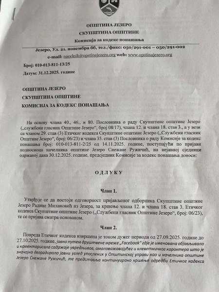 Radica Milanović, odbornica Narodnog Fronta u opštini Jezero tvrdi da je u ovoj opštini konstantno prisutno gušenje slobode mišljenja. Ona objašnjava da je zvanično opomenuta od strane opštinske Komisije za kodeks ponašanja zbog svojih komenatara na privatnom profilu na Facebooku i kritika poteza opštinskog rukovodstva i načelnice Snežane Ružičić.