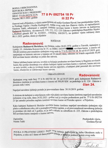 Tekstom Nušić i ja - dva raba robijaška posprdno sam objelodanio rješenje kojim Osnovni sud u Prijedoru novčanu kaznu od 500 KM zamjenjuje sa 10 dana zatvora. Iako je u pravnoj pouci navedeno pravo na žalbu nisam reagovao jer je rješenje sadržavalo toliku količinu nepravilnosti (nezakonitosti!) da naprosto nije bilo pravno primjenjivo. Išao sam za nepisanim principom da se na NEBULOZE naprosto pravno ne reaguje.