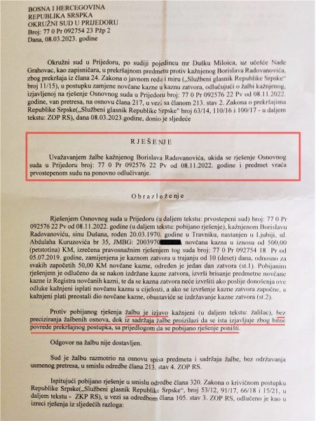Upravo zato što je uskraćeno pravo na žalbu protiv "ispravka rješenja" reagovao sam žalbom, odnosno zato što uvijek činim radnje suprotne volji organa. Doduše i zbog iskustava kako se ispravke koriste za uskraćivanja prava, te drugih pravosudnih marifetluka. Očekivano, drugostepeni Okružni sud u Prijedoru usvaja moju žalbu i ukida skandalozno rješenje o zamjeni novčane kazne zatvorskom kao osnovno i sa takvim pravnim dejstvom.