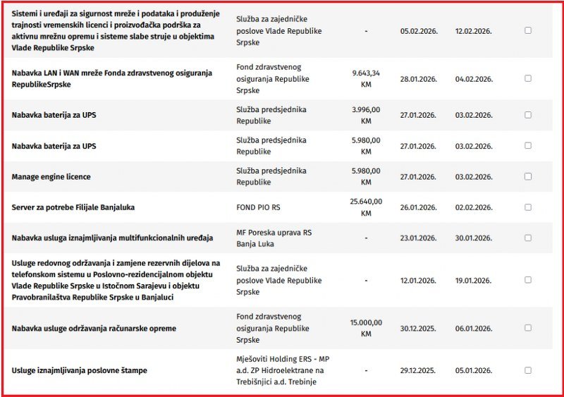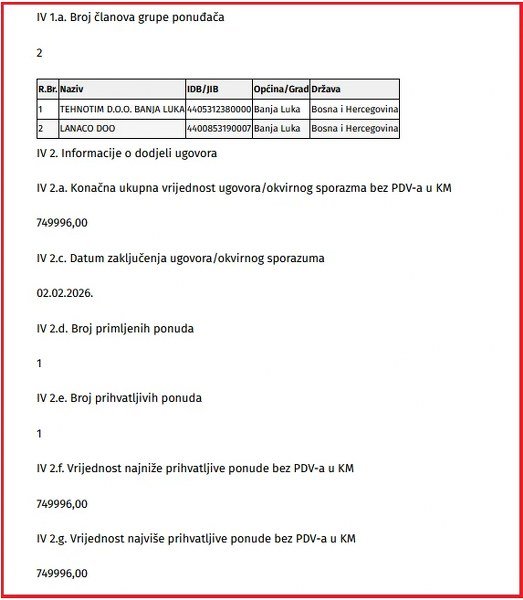 Zanimljivo, Vlada je nabavku krajem decembra procijenila na 750.000 KM (bez PDV-a), stigla je, naravno, jedna ponuda gorepomenutog dvojca i to vrijedna 749.996 KM (bez poreza), samo četiri KM jeftinija. „Tehnotim“ i „Lanaco“, očigledno, znali su da su jedini ponuđači, a ujedno i itekako prihvatljivi.