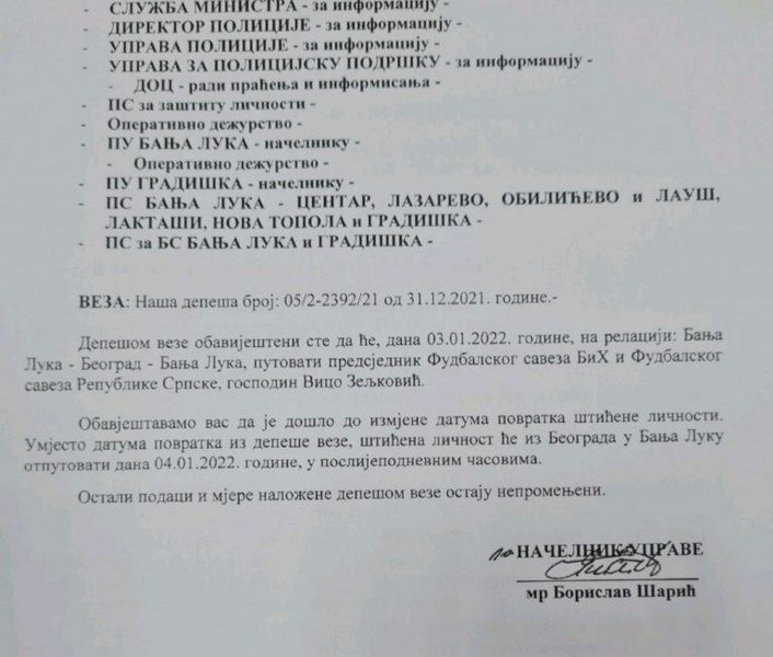 To je vidljivo iz depeše koju je nadležnim policijskim upravama, povodom Zeljkovićevog puta iz Banjaluke za Beograd, početkom januara, poslao načelnik Uprave za obezbjeđenje ličnosti i objekata Ministarstva unutrašnjih poslova Republike Srpske, Borislav Šarić.