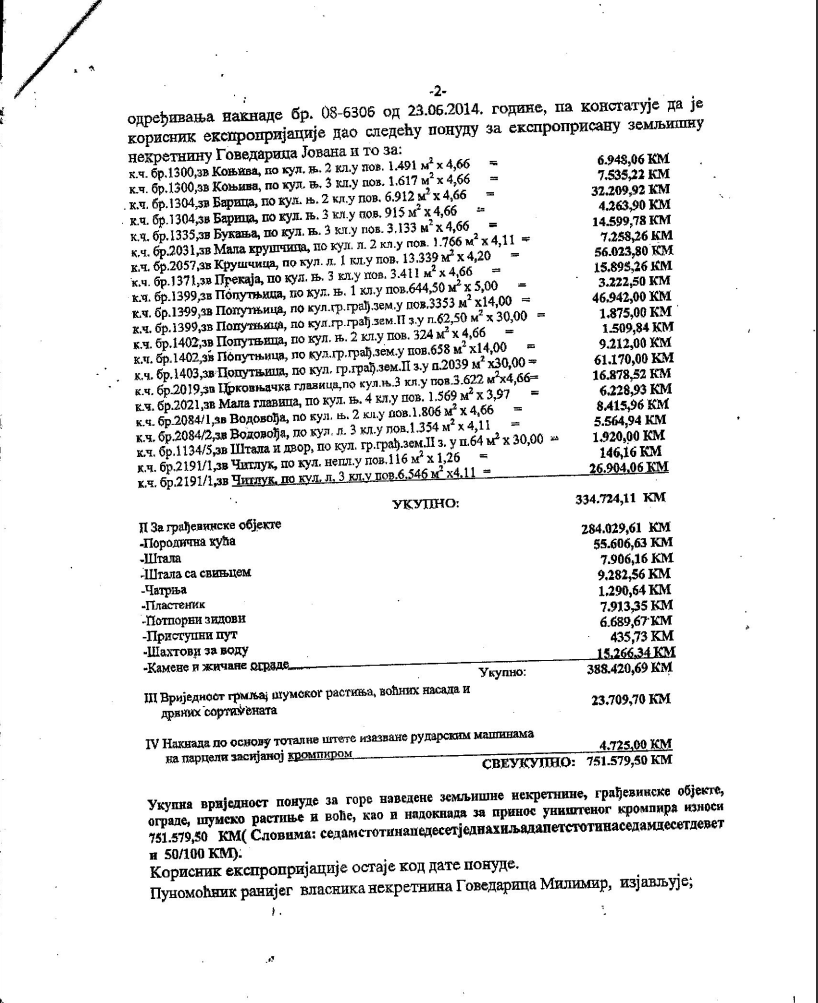 Tako su zemlja i novac prešli u ruke Jovana, oca Milimira Govedarice, kao predmet sporazuma o ekpsproprijaciji. Ukupan iznos koliko je preduzeće RiTe platilo ocu Milimira Govedarice je 616 060,80 KM + 25% (159 015,20) = 770 076,00 KM isplaćeno na račun u NLB Banci.