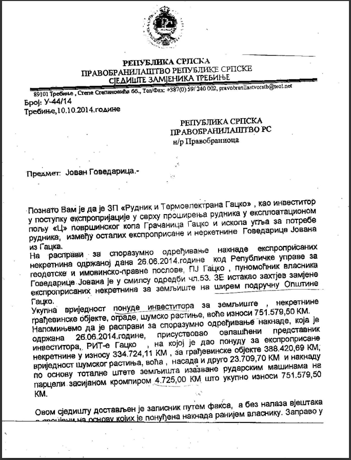 To ne bi bilo vrijedno spomena da upravo preduzeće RiTE Gacko nije od Jovana Govedarice otkupilo porodičnu kuću u širem centru Gacka, koja nije ni blizu rudnika, za nevjerovatnih 770.000 maraka. Imanje je kupljeno na osnovu Ugovora o eksproprijaciji, potpisao ga je bivši generalni direktor Milinko Milidrag na ime kopanja rude, iako je kuća daleko od rudnika, niti je izvjesno da će se rudnik ubrzo tamo širiti.