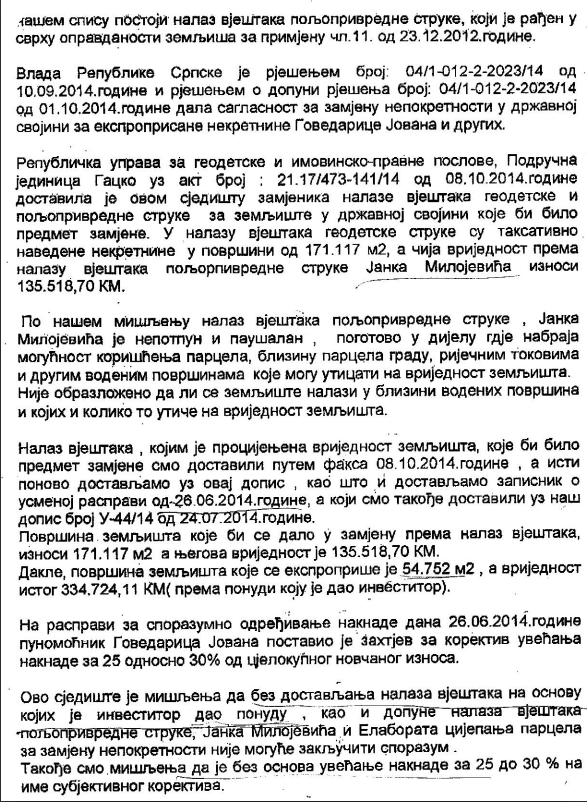 Parcele privremeno oduzete od braće Vučenović, da bi kasnije bile predmet razmjene u slučaju eksproprijacije između RiTE Gacko i Jovana Govedarice