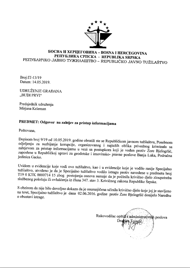 Protiv Zore Bjelogrlić je vođena istraga koja je obustavljena Naredbom o obustavi istrage 2.6.2016.