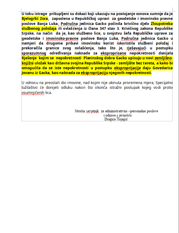 Pravobranilac Republike Srpske Milimir Govedarica, dok je bio na prethodnoj funkciji u MUP-u RS, iskoristio je službeni položaj i eksproprijacijom zemljišta i mahinacijama u preprodaji svoje imovine oštetio državu za blizu milion maraka.