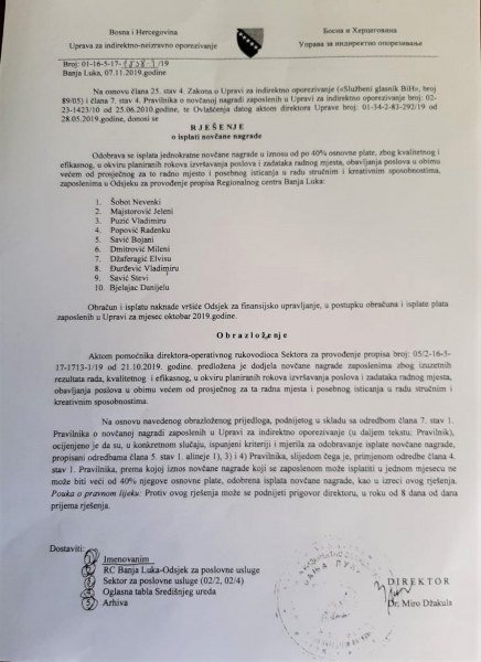 Ni to nije sve. Izdašni direktor Džakula je 4. jula 2019. potpisao Rješenje o isplati novčane nagrade u iznosu od po 40% osnovne plate “a zbog obavljanja poslova u obimu većem od prosječnog, te posebnog isticanja u radu u stručnim i kreativnim sposobnostima” za 45 službenika. Na prvom mjestu liste bila je – Jelena Majstorović. I ovaj dokument objavljujemo.