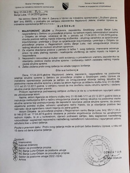 Od 1. aprila iste godine do 2. novembra 2014. direktor Džakula je Jeleni Majstorović u kontinuitetu obnavljao ugovor o radu i radni angažman u UIO, na istom radnom mjestu. Nakon što je Majstorović 2014. diplomirala po ubrzanom postupku na banjalučkom privatnom Univerzitetu za poslovne studije (UPS), na koji se upisala 2013., i to na treću godinu (poštovanim čitaocima se izvinjavamo zbog ranije nepreciznosti jer je, dakle, u pitanju UPS, a ne također privatni univerzitet Aperion), Džakula se pobrinuo za napredovanje „diplomiranog pravnika“. Odmah je interno premješta na mjesto stručnog saradnika za sprječavanje krijumčarenja i prekršaja u Grupi za spriječavanje krijumčarenja i prekršaja RC Banja Luka, što joj je produžavao u kontinuitetu do 30. juna 2015. godine. I taj dokument objavljujemo.