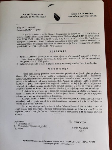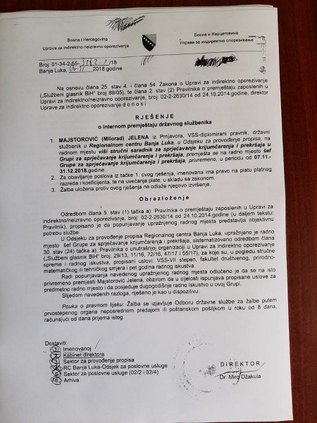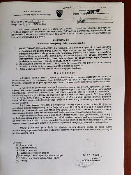 Kao obrazloženje je navedeno da je bila “najuspješniji kandidat za ovo radno mjesto”, iako prethodno niti jedan dan nije radila u Odsjeku za poreze! Ipak, iako je “briljirala” na konkursu u oblasti poreza, tu se zadržala tek dva radna dana pa je 7. maja 2018. premještena na radno mjesto višeg stručnog saradnika za sprječavanje krijumčarenja u Grupi za sprječavanje krijumčarenja i prekršaja u Odsjeku za provođenje propisa RC Banja Luka. Rješenje je potpisao – direktor Džakula, koji je inače dobro ne poznaje.