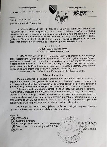 I u decembru 2017. Jelena Majstorović je takođe radila prekovremeno, bez detaljnijeg opisa u čemu se tačno sastojao taj rad, te joj je u januaru 2018. Rješenjem direktora lično odobrena naknada plate za 40 sati, uvećanih za 25%, srazmjerno efektivnom vremenu trajanja tog „rada“.