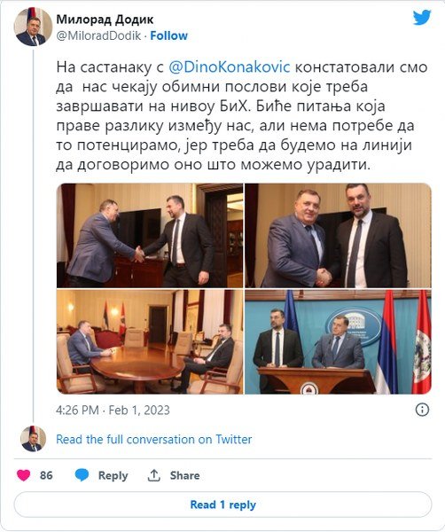Jedan od posljednjih primjera je izjava Milorada Dodika nakon sastanka sa Elmedinom Konakovićem u kojoj ističe da se Kristijan Šmit predstavlja kao lažni visoki predstavnik, i to pitanje treba da se stavi na sto i da se rješava.