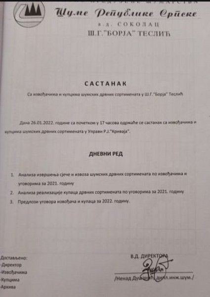 Sastanak kojem je prisustvovalo dvadesetak privatnika vodili su generalni i tehnički direktor Šumskog gazdinstva Borja, Nenad Dušanić i Milija Božić, a među privrednicima je bio i Milorad Đurić čiji su kamioni prije par dana zaplijenjeni sa kradenom robom, a koji je u rodbinskim i poslovnim vezama sa Dušanićem i Božićem.