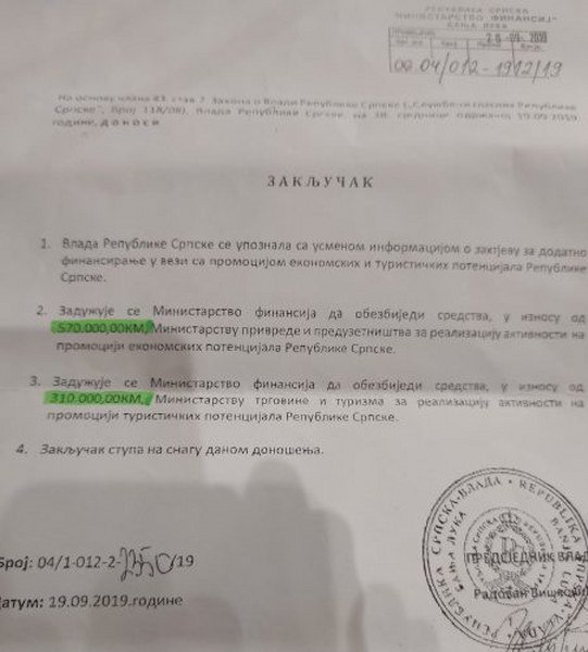 Zanimljivo da je 6 mjeseci ranije, 19.09.2019. godine, Vlada Republike Srpske donijela Zaključak da se upoznala sa „usmenom informacijom o zahtjevu za dodatno finansiranje u vezi sa promocijom ekonomskih i turističkih potencijala Republike Srpske“ i zadužila Ministarstvo finansija Republike Srpske da obezbjedi 880 000 maraka za promociju, i to 570 000 maraka Ministarstvu privrede i preduzetništva a 310 000 Ministarstvu trgovine i turizma. I ovi novci su prebačni u Rusiju.