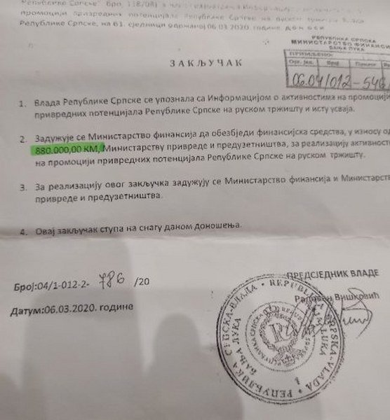 Višković je brzo izašao u susret zahtjevu Duška Perovića, pa je Vlada 06.03.2020. godine donijela Zaključak kojim se zadužuje Ministarstvo finansija Srpske da obezbedi 880 000 maraka za „promociju privrednih potencijala Republike Srpske na ruskom tržištu“, a za realizaciju Zaključaka zadužuje se Ministarstvo finansija i Ministarstvo privrede i preduzetništva Republike Srpske.