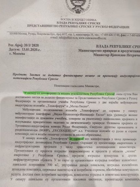 Dakle za pola godine, pored 880 000 maraka redovnog finansiranje rada Predstavništva Republike Srpske u Moskvi, prebačeno je dodatnih 1 760 000 maraka za navodno promovisanje potencijala Republike Srpske u Rusiji i učešće na sajmu. Jasno je da se radi o izvlačenja novca, da se pojedine prenaduvane stavke fiktivno plaćaju dva puta a da je novac završio u džepovima moćnika.
