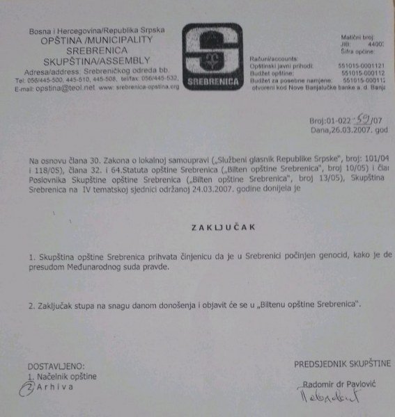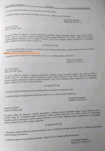 1. Prvim Zaključkom „SO Srebrenica traži od nadležnih da po hitnom postupku upute u parlamentarnu proceduru donošenje Zakona o zabrani negiranja genocida“,