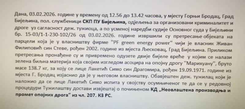 U službenoj bilješci Sektora kriminalističke policije bijeljinske Policijske uprave stoji da su policijski službenici tokom pretresa objekata koji se nalaze na parceli koja je u vlasništvu firme PF green energy power“ pronašli i privremeno oduzeli dvije bijele vreće „u kojima se nalazi zelena biljna materija koja svojim izgledom asocira na opojnu drogu marihuanu“.