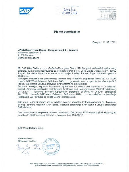 Uporedo, tenderskom dokumentacijom eliminatorni zahtjev je bio posjedovanje obrasca proizvođača, preciznija autorizacija, koju je na osnovu potpisanog ugovora mogla dobiti jedino kompanija B4B Zagreb. Međutim, potvrde SAP West Balkans koje su naznačavale informaciju da je B4B jedini ovlašteni partner za prodaju i implementaciju SAP sistema jednostavno nisu bile tačne.