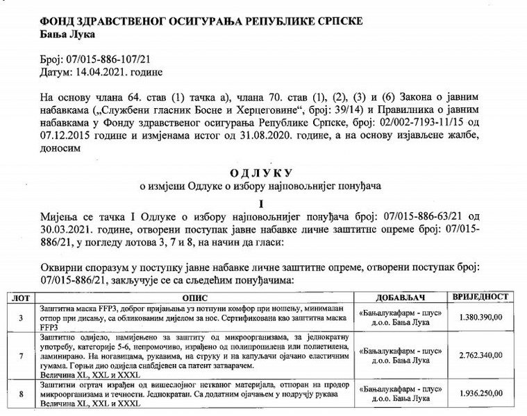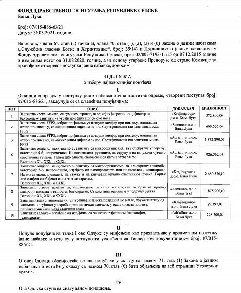 Krajem marta, Fond zdravstvenog osiguranja RS donio je odluku o izboru najpovoljnijih ponuđača za nabavku lične zaštitne opreme. Tokom postupka poništena su dva lota od ukupno 10, koliko je Fond raspisao u februaru, a čija je vrijednost 10.270.000 KM.
