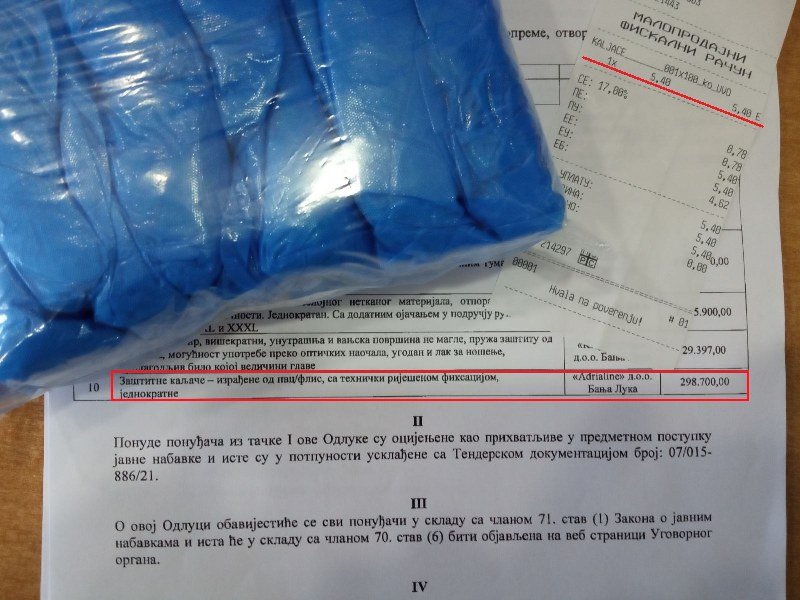 A koliko je Fond preplatio kaljače pokazuju i cijene u slobodnoj prodaji, odnosno u apotekama gdje je cijena za 100 komada ovih jednokratnih kaljača 5,40 KM. Što znači da bi Fond da je kupovao ovu zaštitnu opremu u apotekama sve platio 54.000 KM.