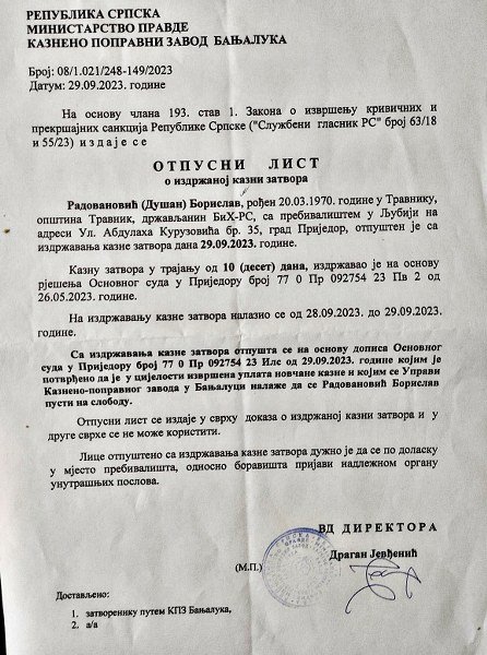 Gornja fotografija prezentuje JEDINI DAKAZ, bar meni izdat, da sam od strane sudske policije uhapšen i sproveden u KPZ Banja Luka, te tamo držan i poslije isteka vremena kada sam morao biti pušten. Pitanje da li bi mi i ovaj dokument uručili da nije bio naophodan za moj otpust sa UKC-a Banja Luka. Predsjednici Osnovnog suda u Prijedoru Danijeli Elenkov, po čijem nalogu sam sproveden, iz bolnice (putem zatvorske uprave) istog dana podnio sam zahtjev za hitno prekidanje izdržavanja kazne i ujedno je obavijestio o premlaćivanju.