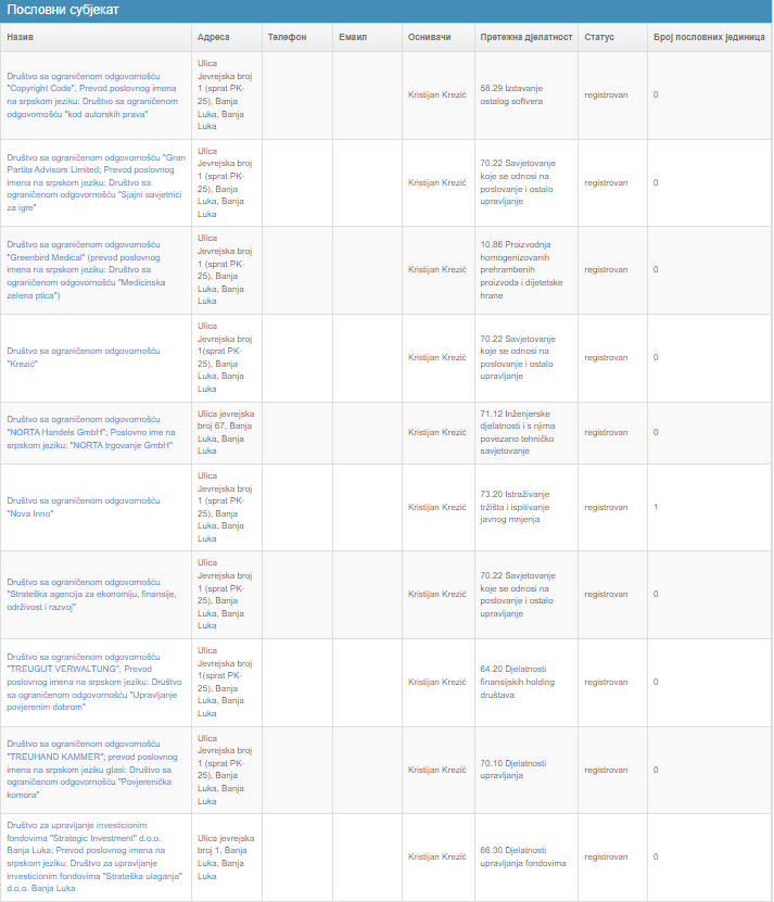 Zanimljivo je da su sva pravna lica, devet firmi i jedan fond, osnovana u prošloj i ovoj godini i da se sva nalaze u strogom centru grada, u Jevrejskoj ulici. Krezić je i direktor u svim preduzećima.