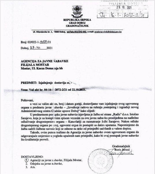 „U predmetnom postupku javne nabavke firma 'Radis“ izjavila je žalbu, koja je sa kompletnim spisom, proslijeđena na odlučivanje Kancelariji za razmatranje žalbi BiH, kao drugostepenom organu. Nakon odluke, postupićemo po datim uputama. Napominjemo da žalba sadrži navode koji se odnose na neke od primjedbi sadržanih u vašem dopisu“, potpisao je Jerinić.
