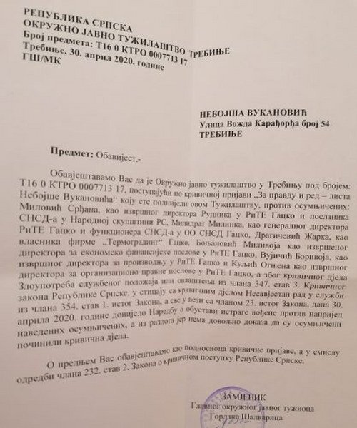 Nekoliko godina nakon što sam podnio Krivičnu prijavu protiv organizovane kriminalne grupe koja je uništila Rudnik i termoelektrane Gacko, danas sam dobio obavještenje Okružnog tužilaštva u Trebinju da je obustavljena istraga protiv grupe na čelu sa Srđanom Milovićem, tada poslanikom SNSD-a u Narodnoj skupštini Republike Srpske, jer navodne čestite kadije nisu imale dokaza iako sam im dostavio obimnu dokumentaciju.