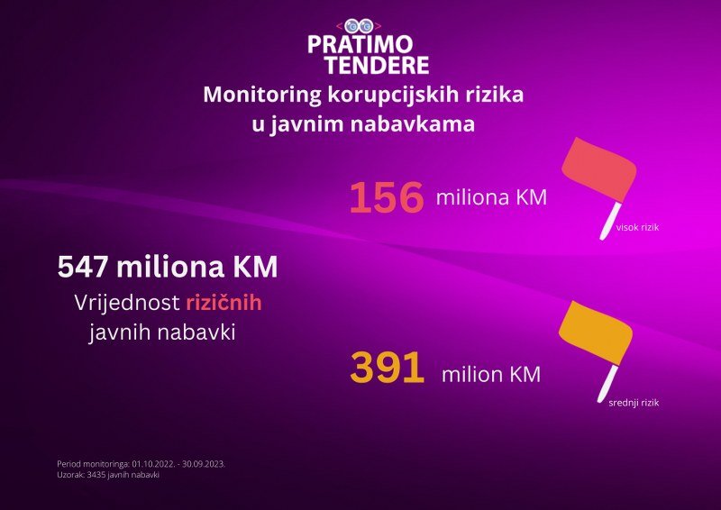 Čak 547 miliona maraka na javne nabavke potrošeno je koruptivno i netransparentno, dok je oko 77 odsto nabavki u protekloj godini bilo rizično, pokazuju rezultati praćenja 3.435 postupaka javnih nabavki ukupne vrijednosti 590,1 milion KM bez PDV-a.