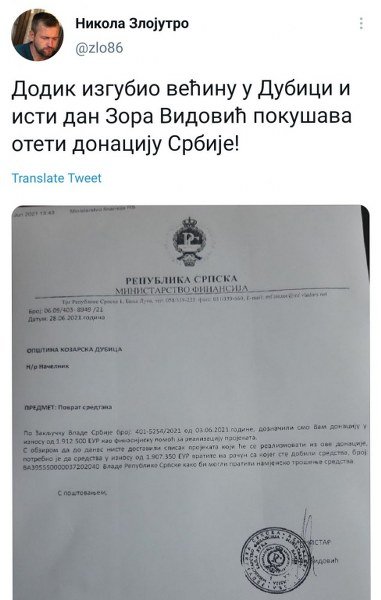 Jedan od, sad već bivših, odbornika SNSD-a je na društvenoj mreži Twitter objavio i skandaloznu odluku Ministarstva finansija RS da Opština Kozarska Dubica treba da vrati novčana sredstva u iznosu od skoro dva miliona evra koja je Vlada Srbije doznačila ovoj opštini na ime pomoći budžetu i realizaciji uglavnom infrastrukturnih projekata.